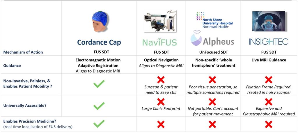 i. SonicALA clinical trial of SDT for newly diagnosed GBM prior to resection (safety study, Milan, Italy). This trial used the more invasive Insightec Exablate machine that requires skull pins to place a fixed helmet on the patient, with treatment performed lying still inside an MRI scanner (i.e. requiring considerably more resources, time and cost compared to the Cordance Cap – see comparator table below); https://www.clinicaltrials.gov/study/NCT04845919