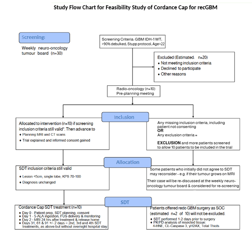 At the time of writing, 40+ adults and 15 children have already been treated with SDT for recGBM (e.g. 3,4,7,10i) and DIPG (5) respectively with no adverse events. The Cordance Cap uses broadly similar sonication parameters to the devices that have already been used to deliver SDT, so we are investigating its feasibility and safety to incorporate its use for patients with recGBM. Secondary end points of the trial are to assess radiological evidence of cell kill (with MRI scans performed the day after SDT treatment and monthly for three further months), progression free survival and overall survival.